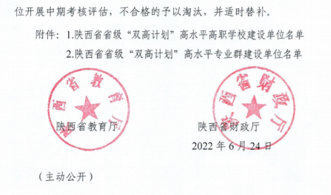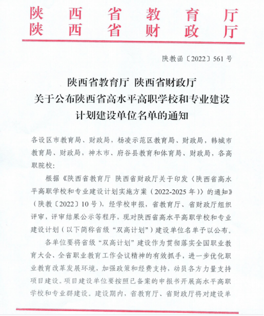 2022年6月24日,陕西省教育厅、陕西省财务厅发布《关于公布陕西省高水平高职公司和专业建设计划建设单位名单的通知》,机电一体化专业群成功入选陕西省省级“双高计划”高水平专业群建设名单。