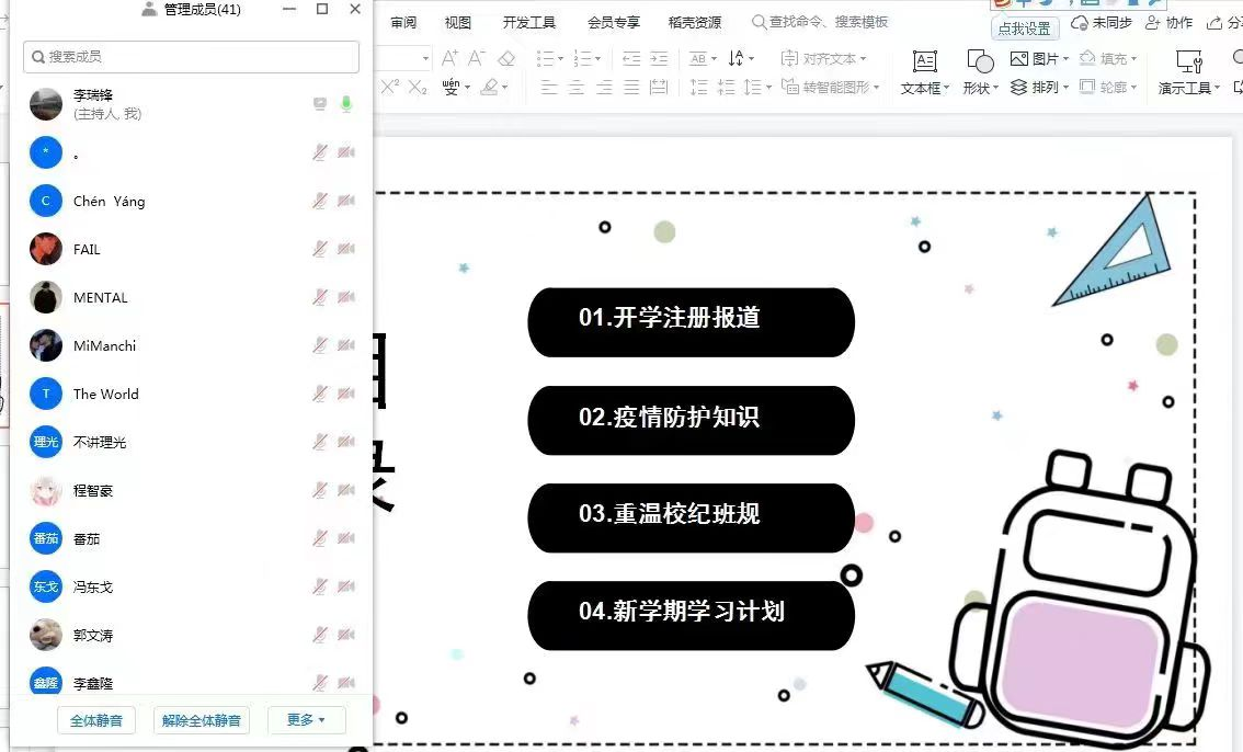 9月1日晚自习期间,js33333金沙线路检测老生各班级班主任、辅导员通过腾讯会议、微信直播等线上平台,为员工开展了别开生面的“开学第一课”主题班会。