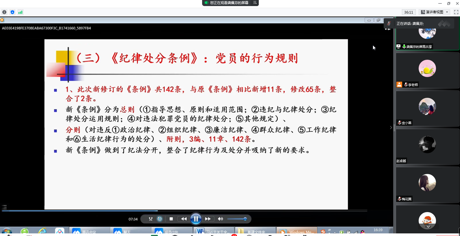 全体参会人员观看学习纪律教育公开课:党章党规党纪与党员干部修身律己。全党要牢固树立党章意识,真正把党章作为加强党性修养的根本标准,自觉遵纪守法、合规笃行,坚定理想信念,增强法制观念,廉洁从业,合规履职作为党的工作、党内活动、党的建设及基本工作的根本依据。