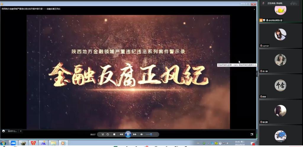 接着,全体参会人员观看警示教育片—金融反腐正风纪,我们要以典型案例为戒、警钟长鸣,深刻自我剖析,牢固树立拒腐防变意识,保持清正廉洁的工作作风,共同营造风清气正的工作氛围。为此,要坚持把党的政治建设摆在首位,坚持党的领导,增强“四个意识”、坚定“四个自信”、做到“两个维护”,自觉在思想、政治以及行动上同党中央保持高度一致。