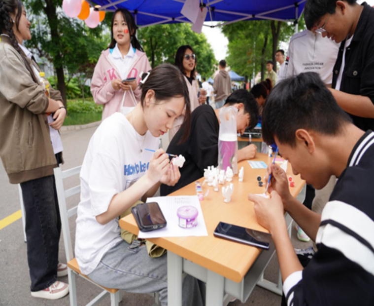 本次游园会活动,公司“绘制幸福”主题项目主要有绘制幸福容器、彩绘涂色娃娃和巧手折出幸福花等,同学们充分发挥自己丰富的想象力绘制各种幸福容器,按照个人喜好进行涂色。经过认真仔细的绘画、创意涂鸦和同学们心灵手巧的折纸技法,他们“专属”的石膏娃娃、折纸作品和幸福容器就此诞生。此外,还进行现场爱心祝福语的书写、张贴,及手工彩色幸福花的赠送,让同学们学会感知幸福和传递幸福。