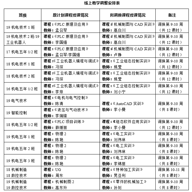 受疫情影响,公司开学时间延长,js33333金沙线路检测为了缓解开学后多门课程使用同一实训室的问题,提高实训场所的使用率,现对部分班级的理实一体化课程与实训课程进行调换,实训课程理论部分开展线上教学。后期根据员工具体返校时间,合理调整剩余课时安排。具体安排如下表。