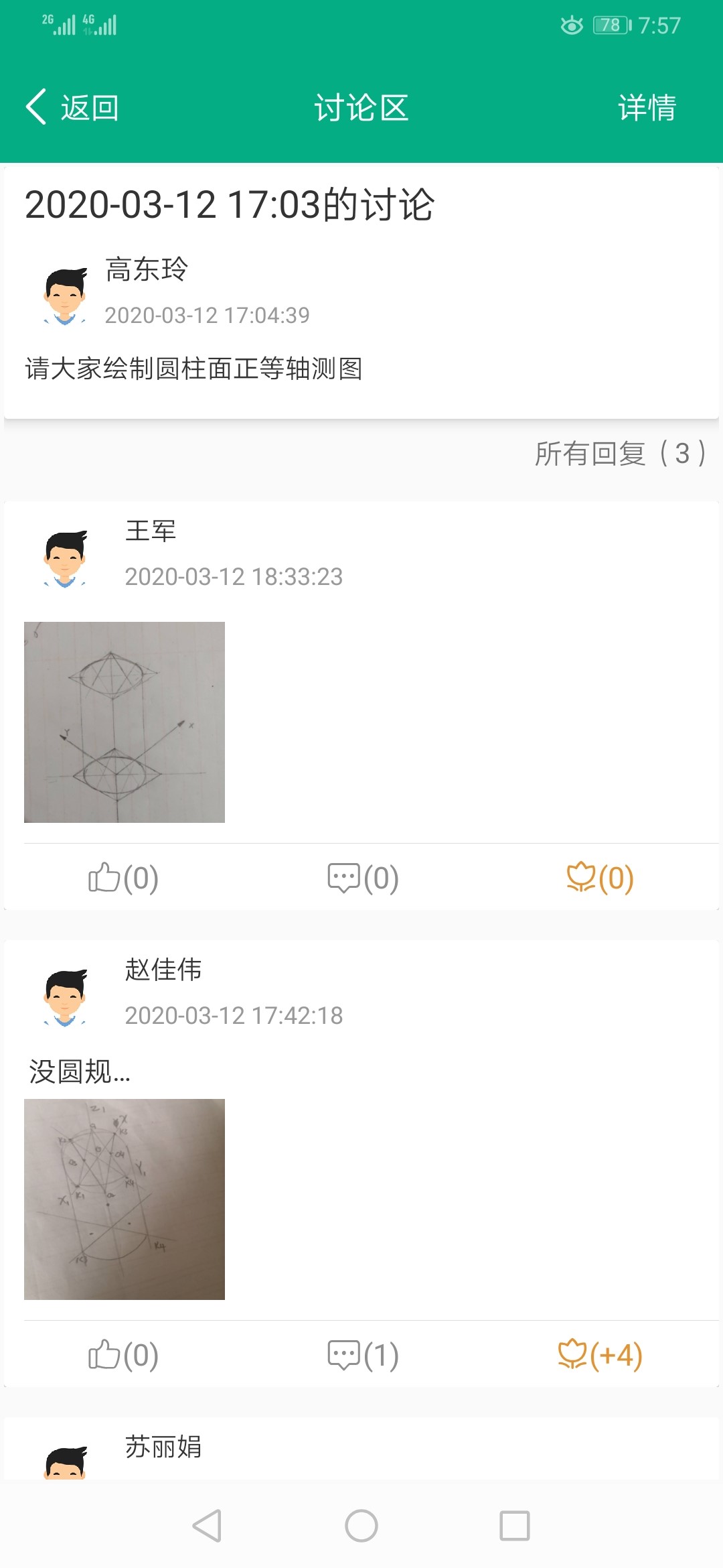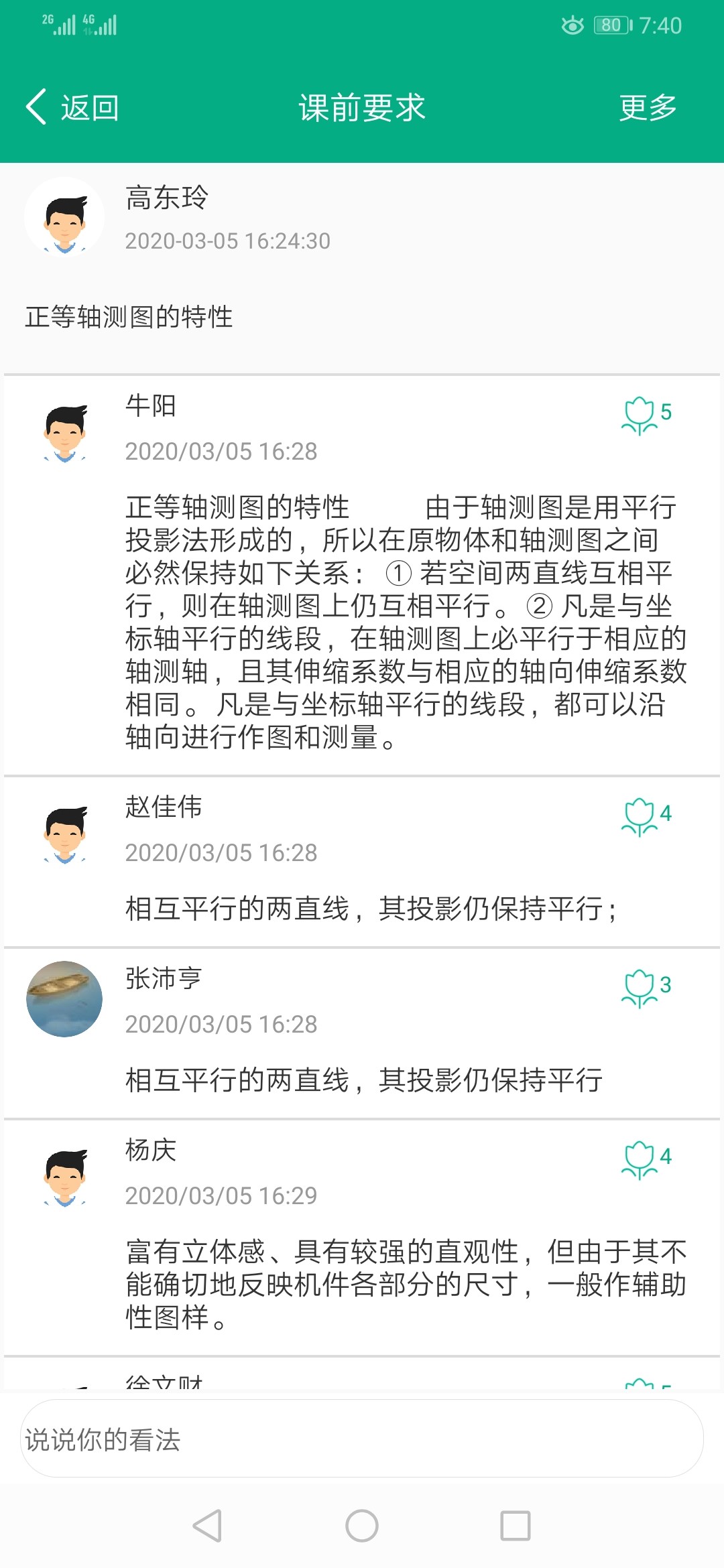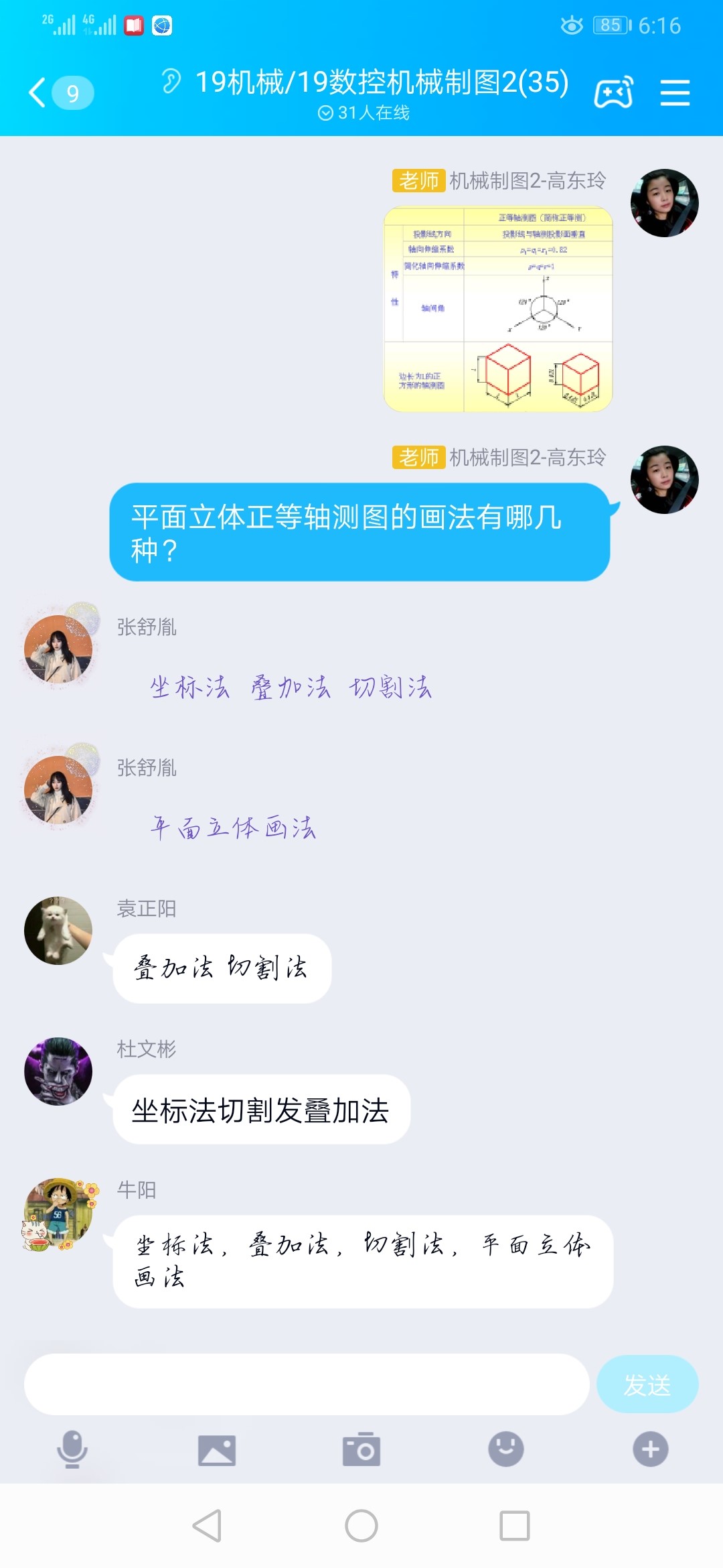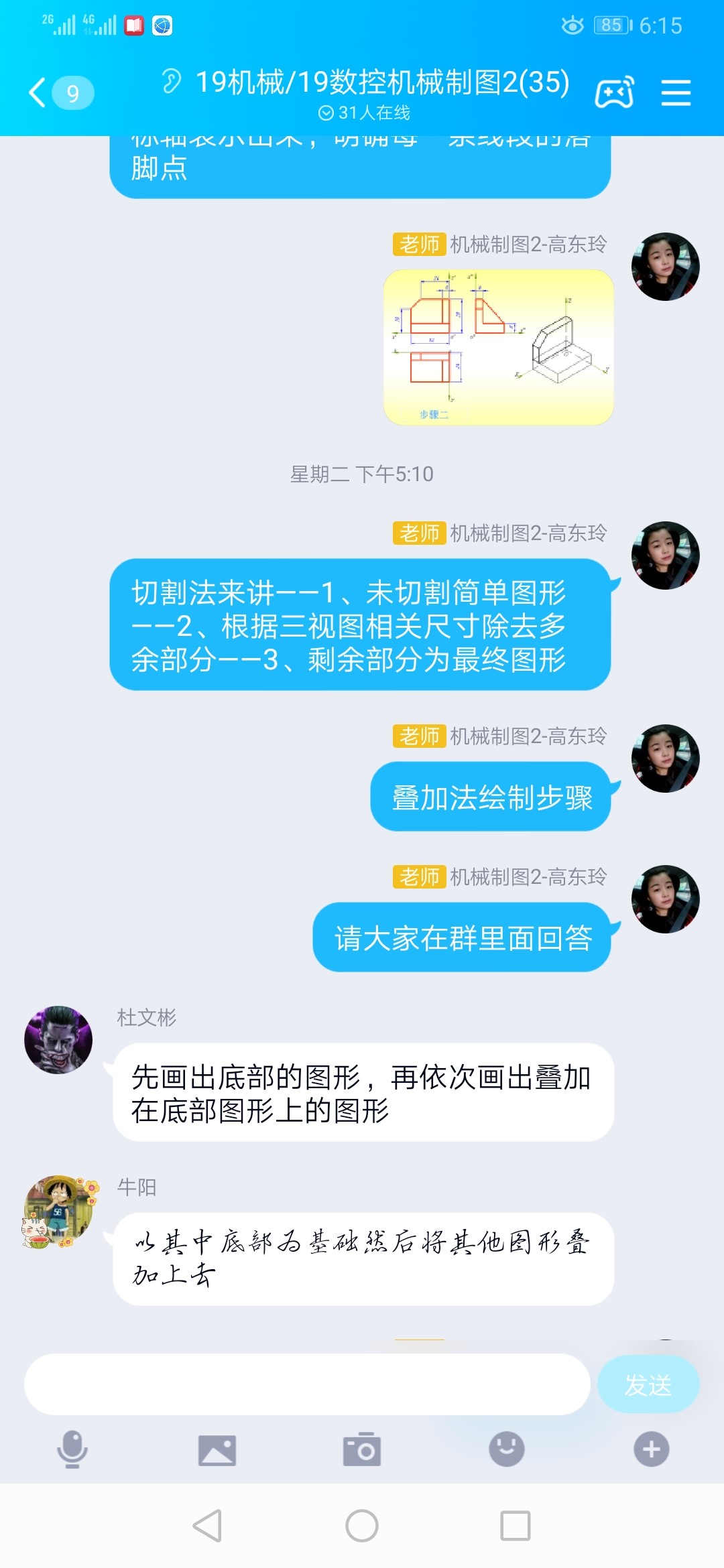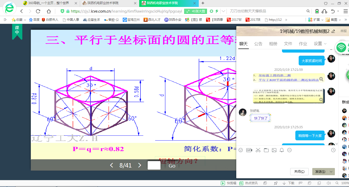 3、针对正等轴测图的画法,以引导的方式进行,比如:坐标法,切割法,叠加法,通过教学平台理论铺垫后,仍然在qq班级群以语音和文字方式对画法的理解进行分步多频率的引导提问,让同学们及时以文字或语音方式进行讨论,及时回复。老师的评价也以文字方式在qq群及时发布。