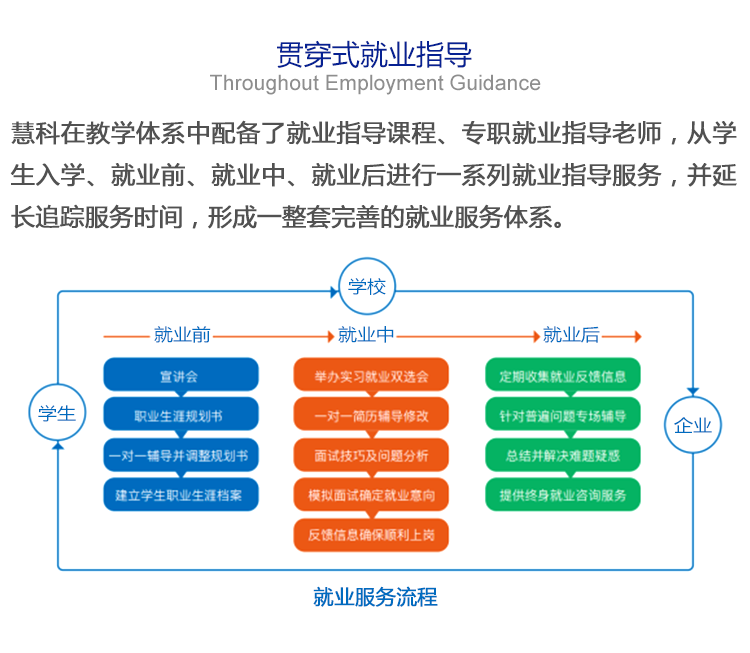 第一、第二学年在校学习,由公司与企业一同进行实战式教学。企业承担80%的教学内容。企业协助公司共同实践员工日常管理工作,培养员工好学的优良素质。第三学年前三个月进行企业案例化实训,接下来三个月进行就业实训,后四个月进行就业指导。培养可适应当今社会发展的高端技术性人才。