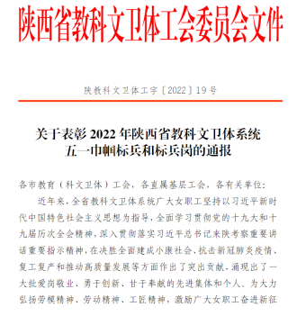 近日,《关于表彰2022年陕西省教科文卫体系统五一巾帼标兵和标兵岗的通报》(陕教科文卫体工字〔2022〕19号)正式公布。js33333金沙线路检测机电系获得”陕西省教科文卫体系统五一巾帼标兵岗“荣誉称号。